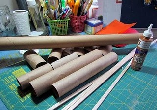 Vai precisar de rolos de papeis, madeira fininha ,cola, tinta spray metalizada